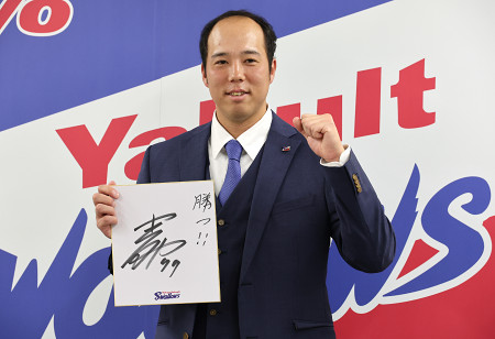 ヤクルトの青柳は現状維持の5000万円で更改した。写真は契約更改後、撮影に応じる青柳。(金額は推定)=15日、東京都港区 【時事通信社】