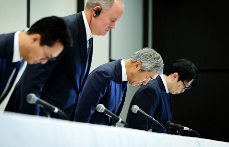 プルデンシャル生命保険は23日、東京都内で記者会見し、社員ら100人超が顧客から計31億円を不正に受け取っていた問題について、間原寛社長(右から2人目)は「心より深くおわびする」と謝罪した。 【時事通信社】