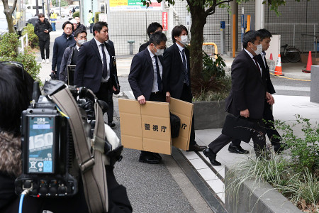 東京都品川区の民家や隣接するアパートに放火したとして、アパート管理会社の社員内藤寛己容疑者(31)ら6人が逮捕された事件。写真は内藤容疑者の勤務先の家宅捜索に入る警視庁の捜査員ら=20日、東京都港区 【時事通信社】
