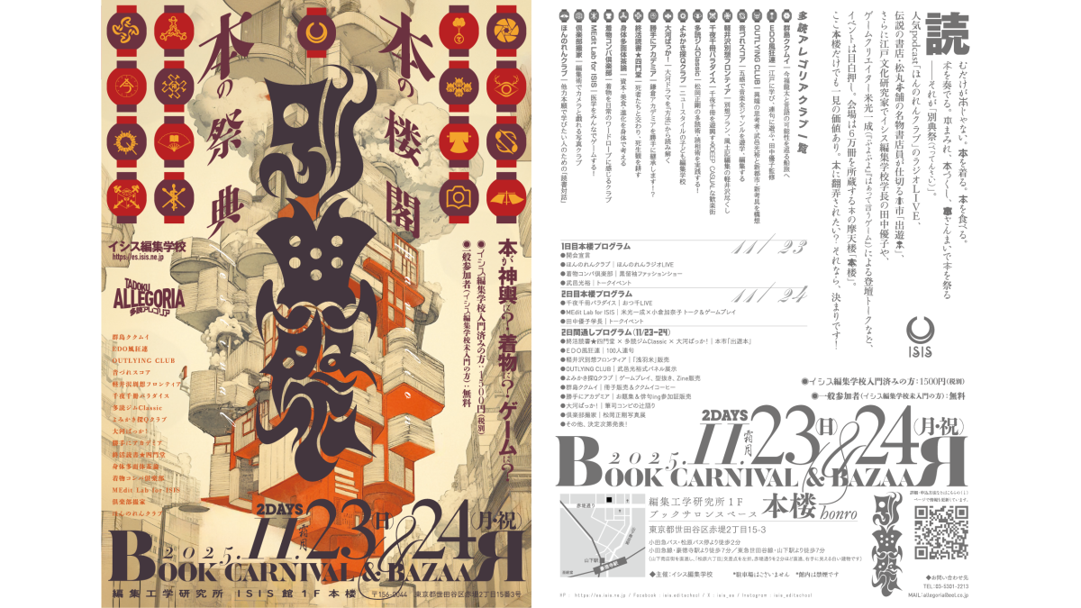 23日は開会宣言の後、ほんのれんクラブによる「ほんのれんラジオLIVE」、着物コンパ倶楽部による「黒留め袖ファッションショー」、武邑(たけむら)光裕さんによるトークイベントを行う。24日は千夜千冊パラダイスによる「おっかけ千夜千冊ファンクラブLIVE」、MEdit Lab for ISISによる、米光一成さんと小倉加奈子さんのトーク&ゲームプレー、田中優子学長による「酒上夕書斎SPトークイベント」を行う。
